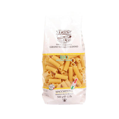 Produced with Italian hard grains, coming directly from the agricultural supply chain, the bronze drawing of the IRIS BIO Organic Durum Wheat Macaroni, allows you to get a pleasantly rougher and porous paste, ideal for absorbing and enhancing sauces. Because of the size, Macaroni is the ideal specimen for stuffing with fillings such as cheese or sauce, baked as a casserole.