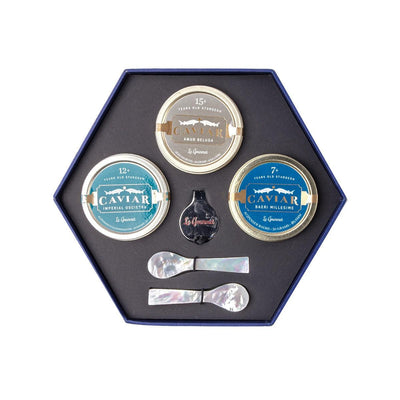 Le Gourmet brings you this elegant caviar box that contains three different finest and precious caviar, with very distinct aromas, 30grams per tin. Amur Beluga, highly sought-after caviar in the world, with delicate almond aromas; Imperial Oscietra, direct from the Caspian Sea, with silky texture, earthy-nut taste and long finish; Baeri Millésime, with chestnut, woody and hazelnut flavours. It also comes with two mother-of-pearl spoons, which is the perfect utensil of serving these small, luxurious but so delicious eggs.