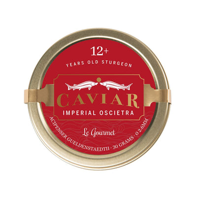 This LE GOURMET Caviar Imperial Oscietra will be your definitive choice if you want nothing but the finest. Direct from the Caspian Sea, the eggs of this Caviar are from 12+ years old Acipenser Gueldenstaedtii sturgeons, and less than 10% can be named as Imperial. With its silky texture, earthy-nut taste and long finish, is best served by itself, or accompaniments such as Blinis topped with creme fraiche, unsalted crackers. This is 30g, 2.8 mm eggs.