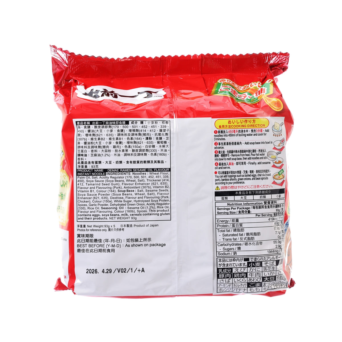 NISSIN Demae Iccho Instant Noodles - Sesame Oil Flavor  (5 x 93g)