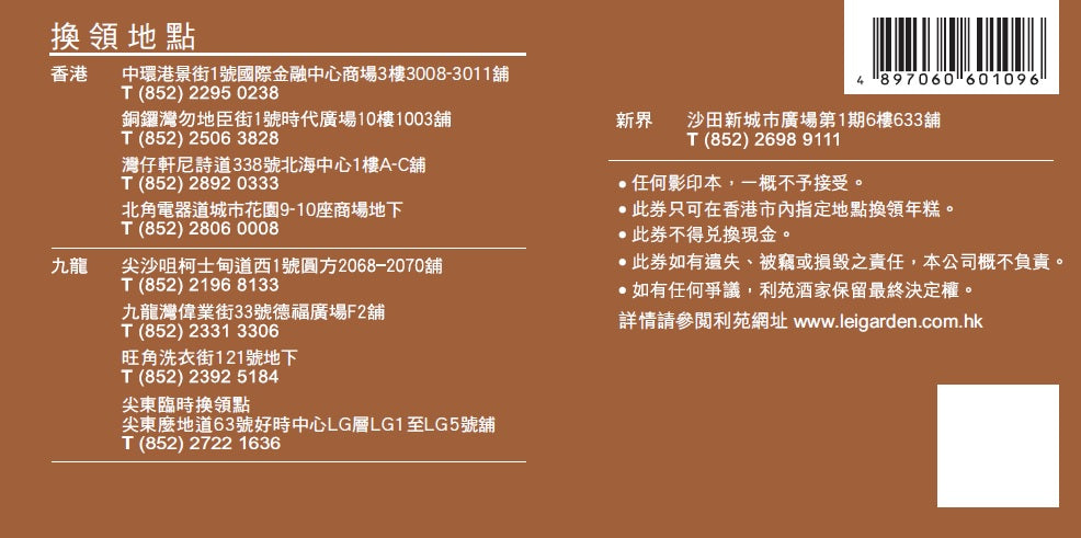 - 31/1/2026 - 9/2/2026: All Lei Garden branches, (except for Tsim Sha Tsui East branch and Kwun Tong branch) and Tsim Sha Tsui East special redemption point