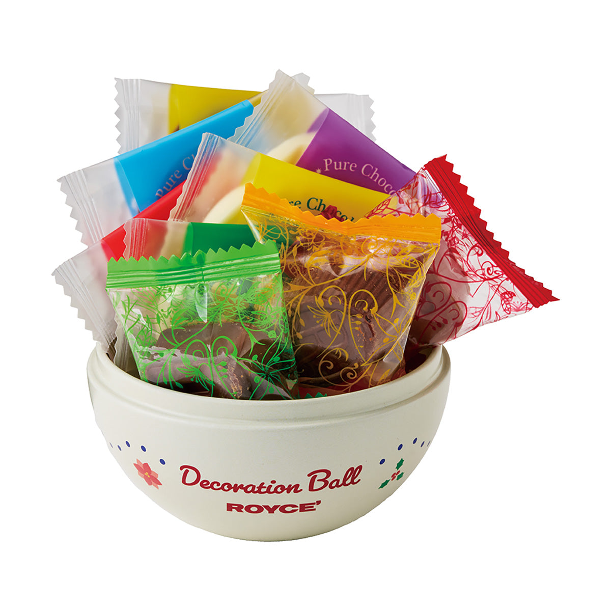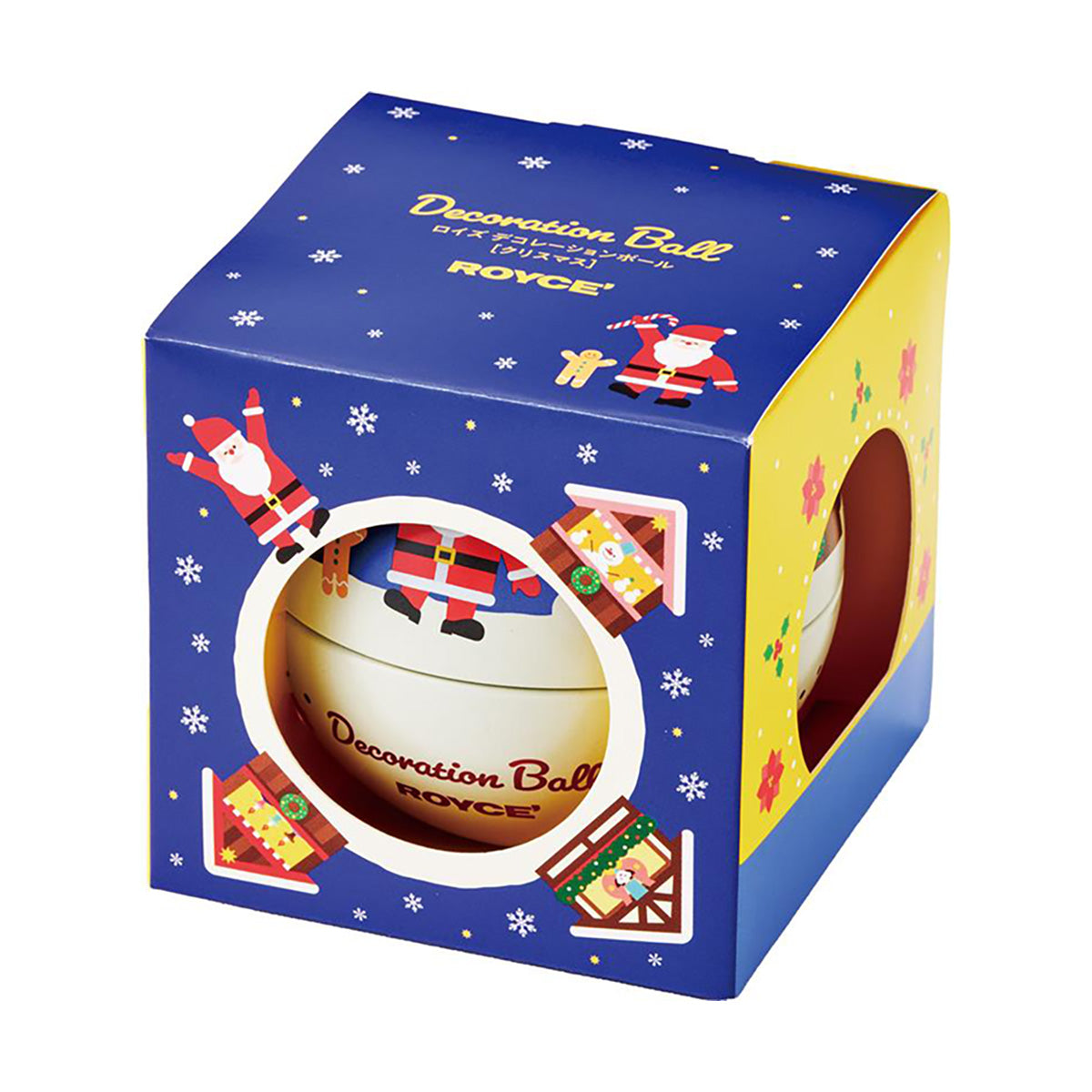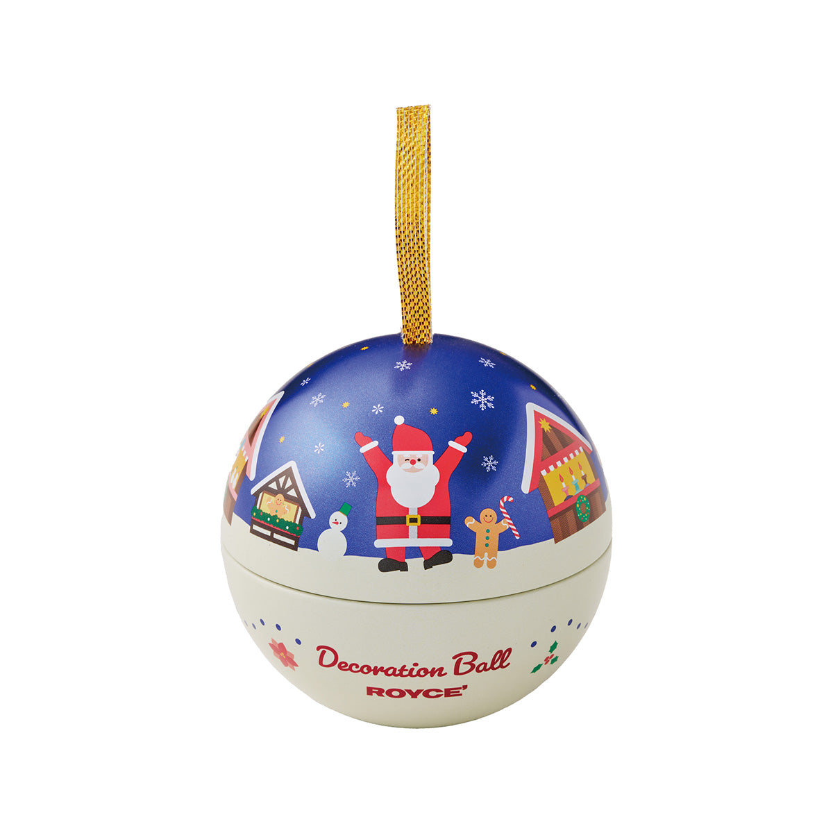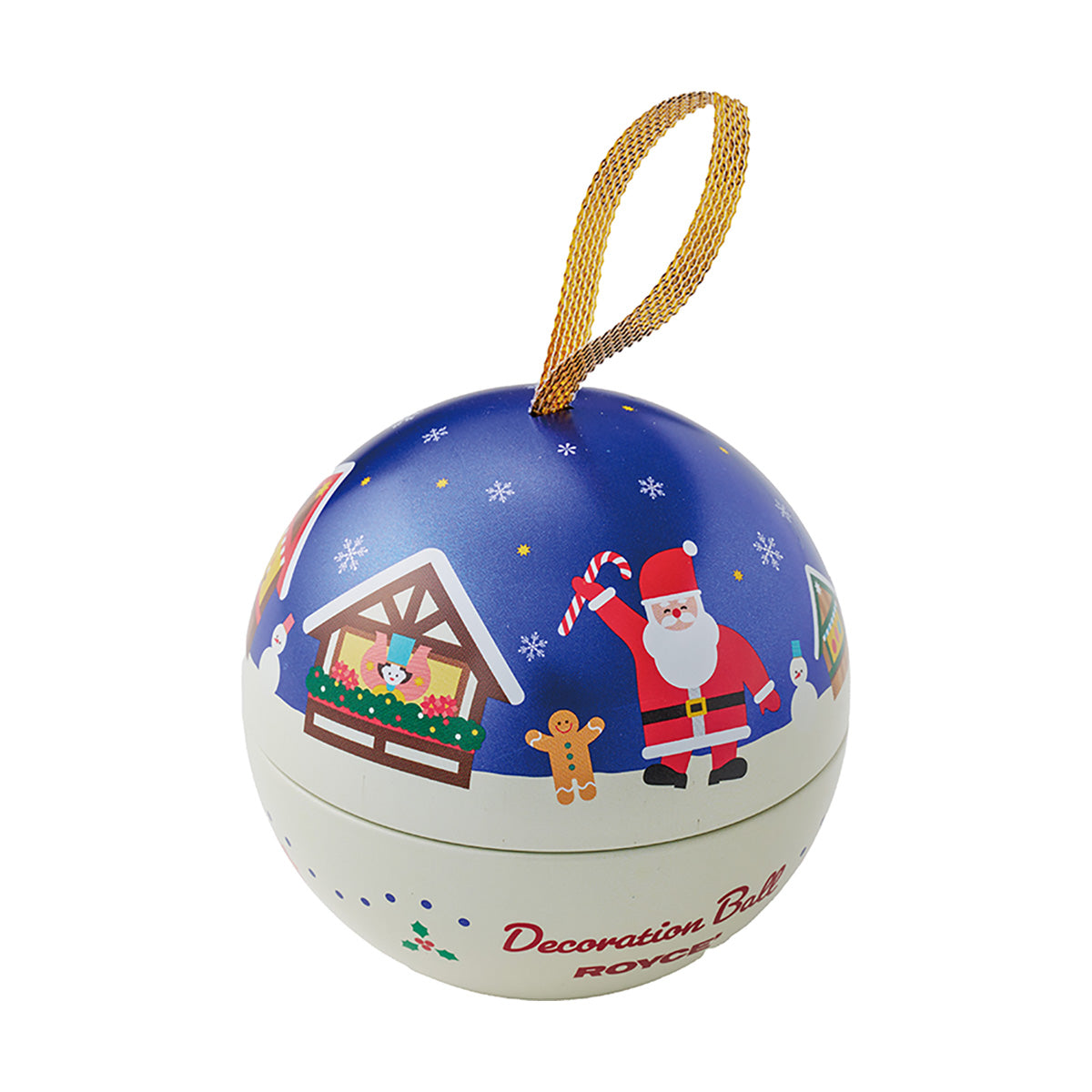 The popular Royce' R chocolate and pure chocolate in a limited Christmas wrapper are packaged in a round can with a sparkling Christmas like red and green checked pattern. The packaged tin can be used as a Christmas tree ornament and sold in a protective box.