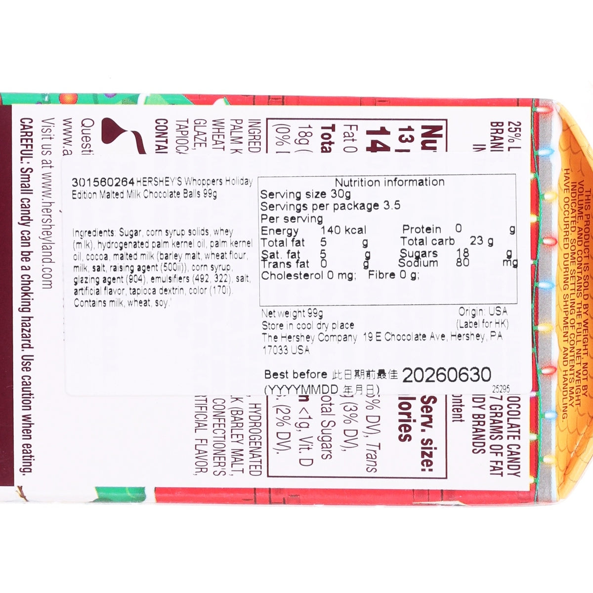 HERSHEY'S Whoppers Holiday Edition Malted Milk Chocolate Balls (99g)