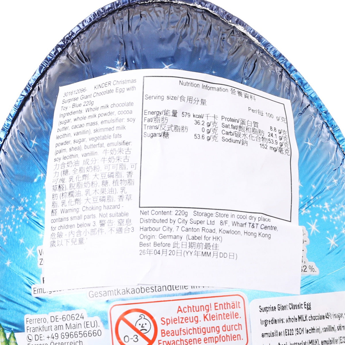 KINDER Christmas Surprise Giant Chocolate Egg with Toy - Blue  (220g)