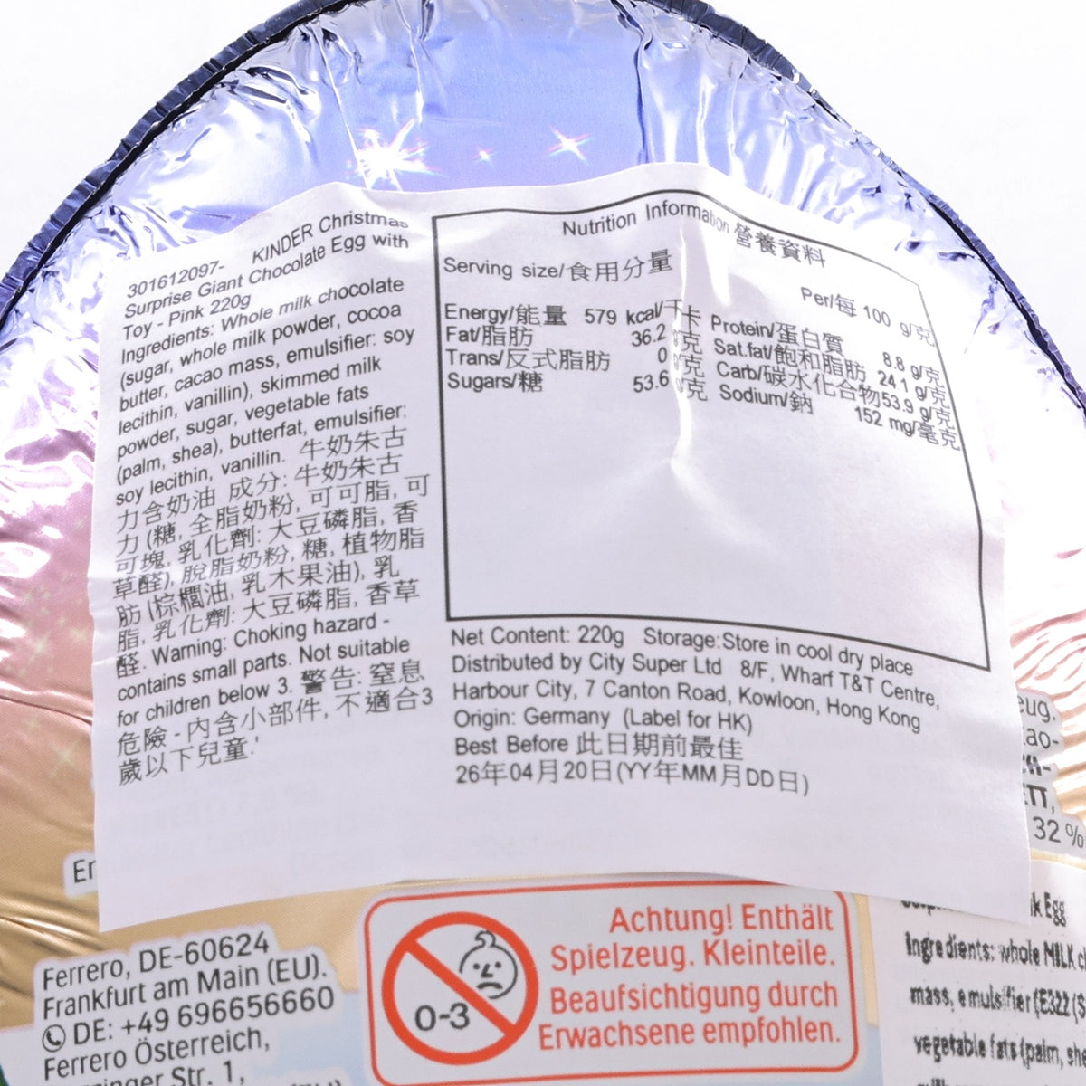 KINDER Christmas Surprise Giant Chocolate Egg with Toy - Pink  (220g)