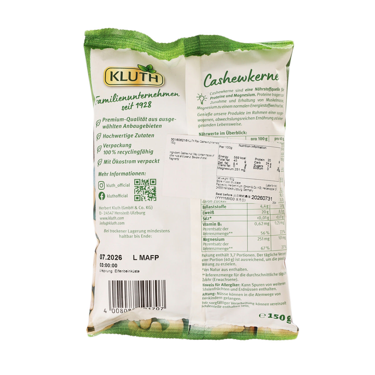 KLUTH Raw Cashewnut Kernels (150g)