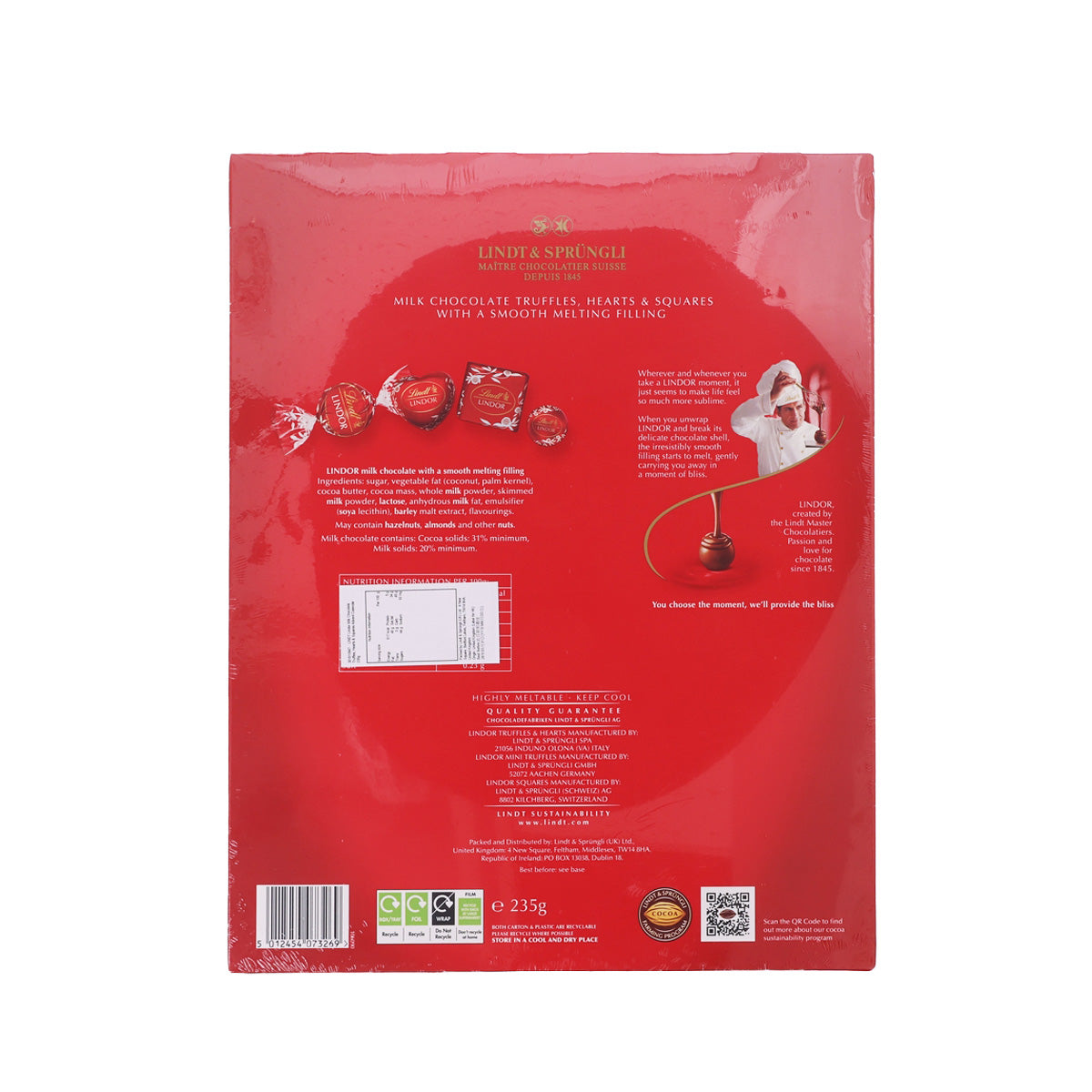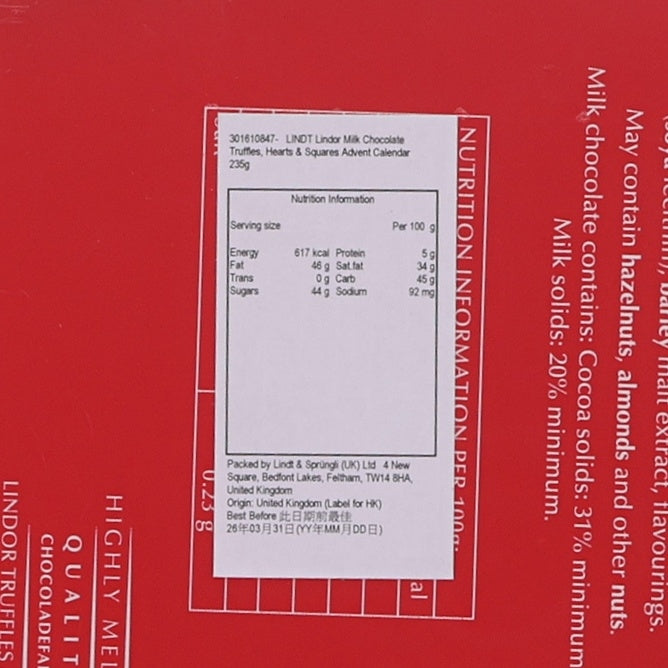 LINDT Lindor Milk Chocolate Truffles, Hearts & Squares Advent Calendar (235g)