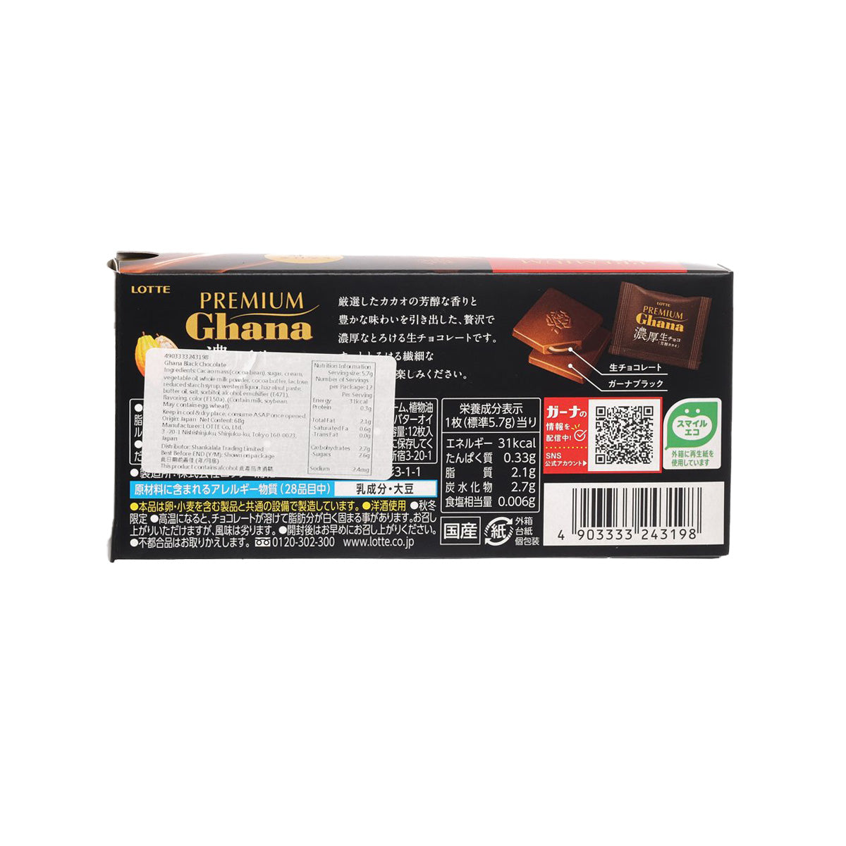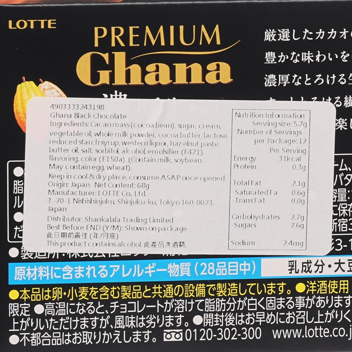 LOTTE Premium Ghana Nama Chocolate - Rich Cacao Flavor (68g)