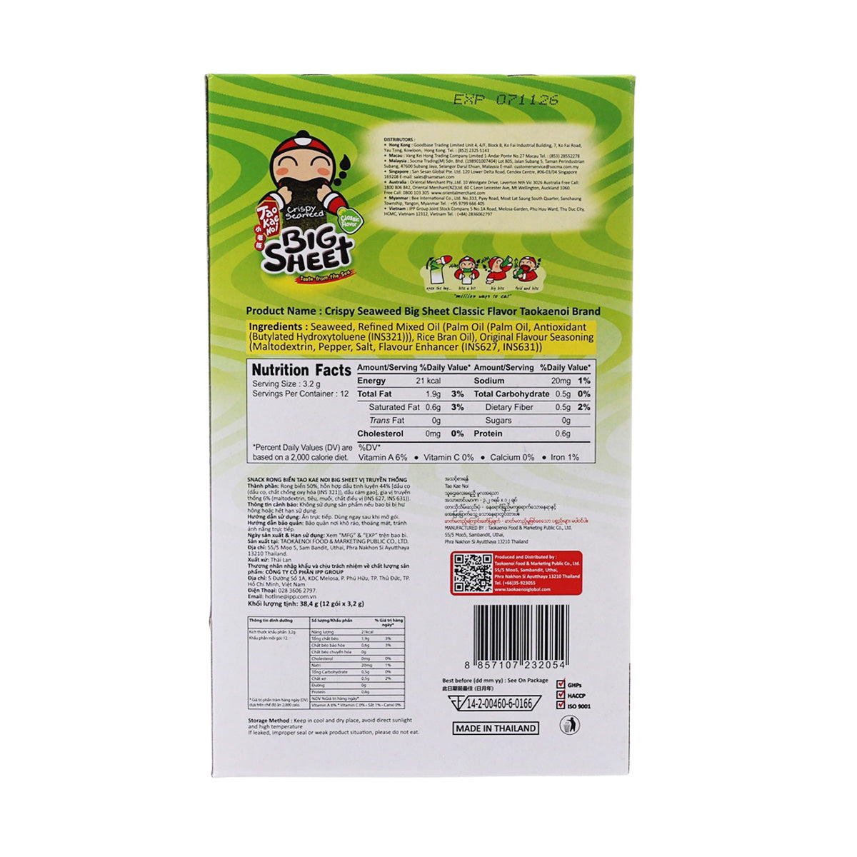 TAOKAENOI Crispy Seaweed Big Sheet - Classic Flavor (12 x 3.2g)