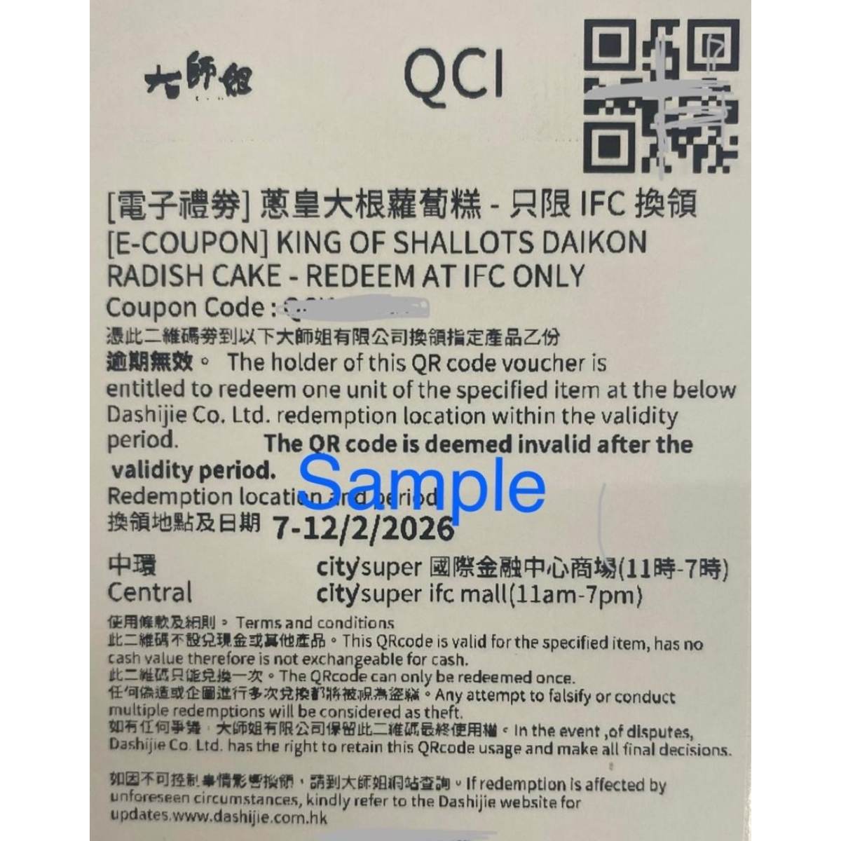 - 這是一張實體禮券。請前往指定兌換點出示二維碼領取您的糕點。