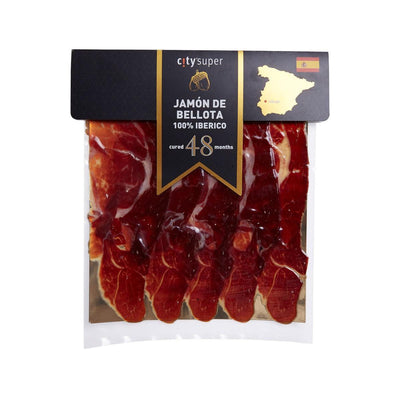 這款精美的切片是來自100%純正伊比利黑毛豬mamellado-lampiño品種,它是製作伊比利亞黑毛豬火腿和醃製肉的最佳品種。豬隻在哈武戈山脈(Sierra de Jabugo)的橡子森林中自由地生活。經醃製48個月的無骨伊比利黑毛豬火腿,味道濃郁,口感極佳,非常適合單獨作為小食或開胃菜。