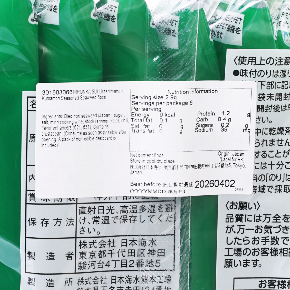 日本海水 浦島海苔 熊本熊味付海苔 (6pcs)