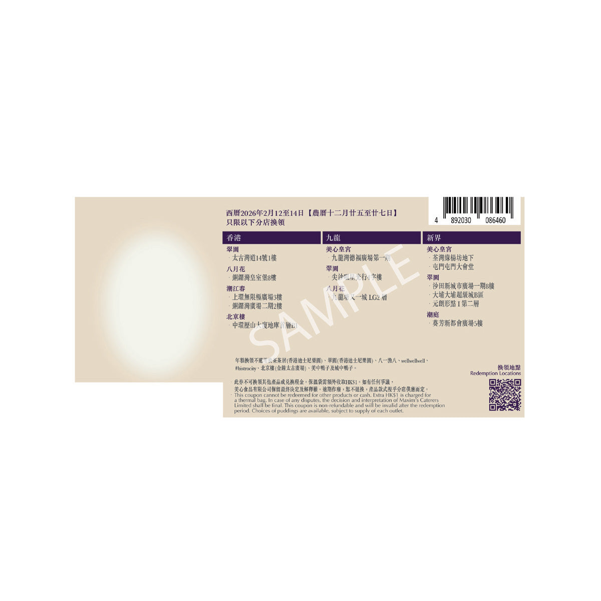 - 2026年2月12日至2026年2月14日:只限指定香港美心集團分店