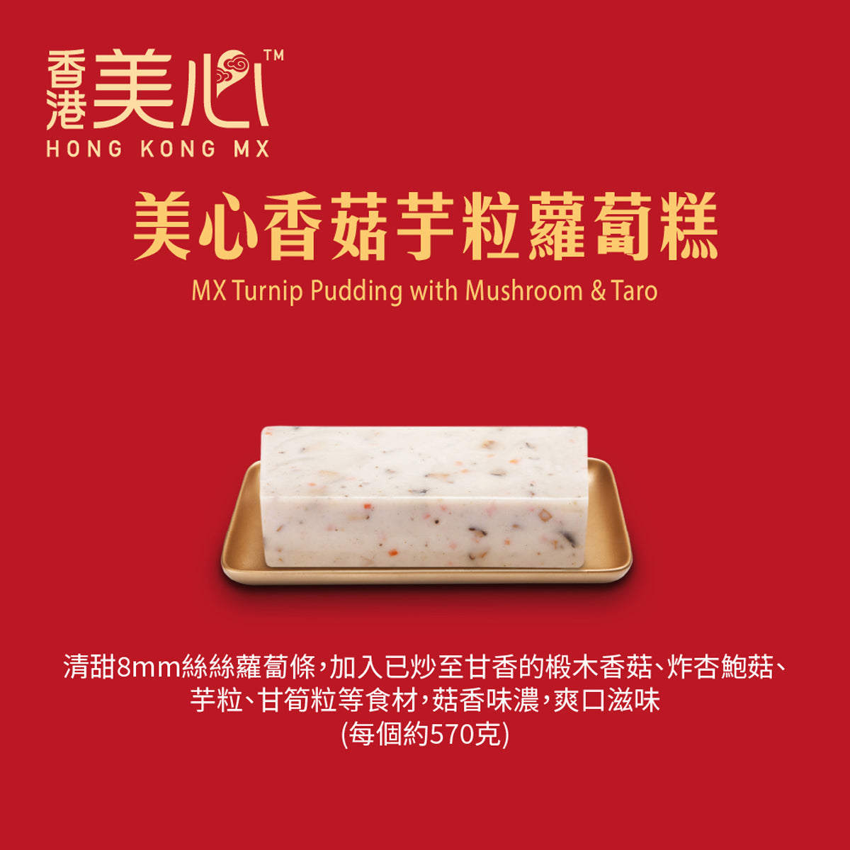 - 蘿蔔糕加入炒至甘香的菇粒、杏鮑菇、芋粒、甘筍粒等食材,菇味香濃,爽口滋味。無添加肉配方,提供更健康選擇。