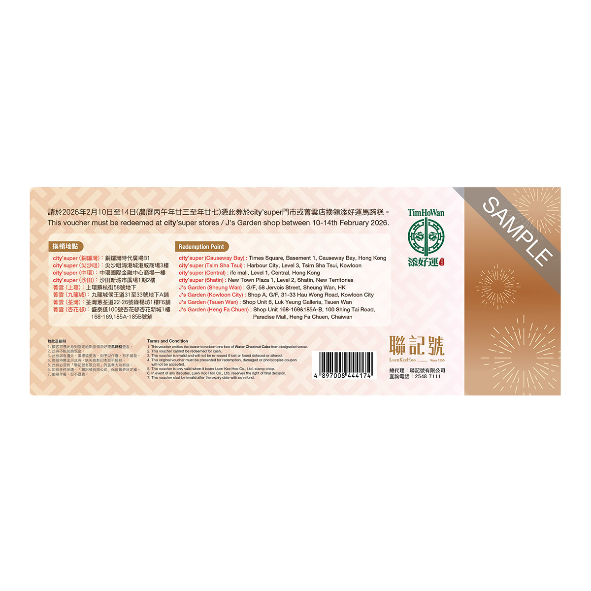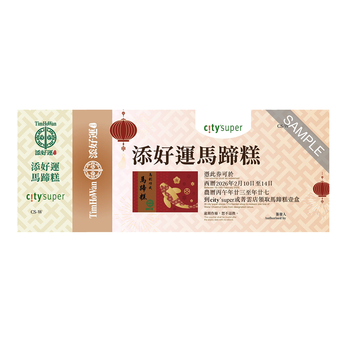 - 顧客可憑此劵到指定地點換領添好運馬蹄糕壹盒。