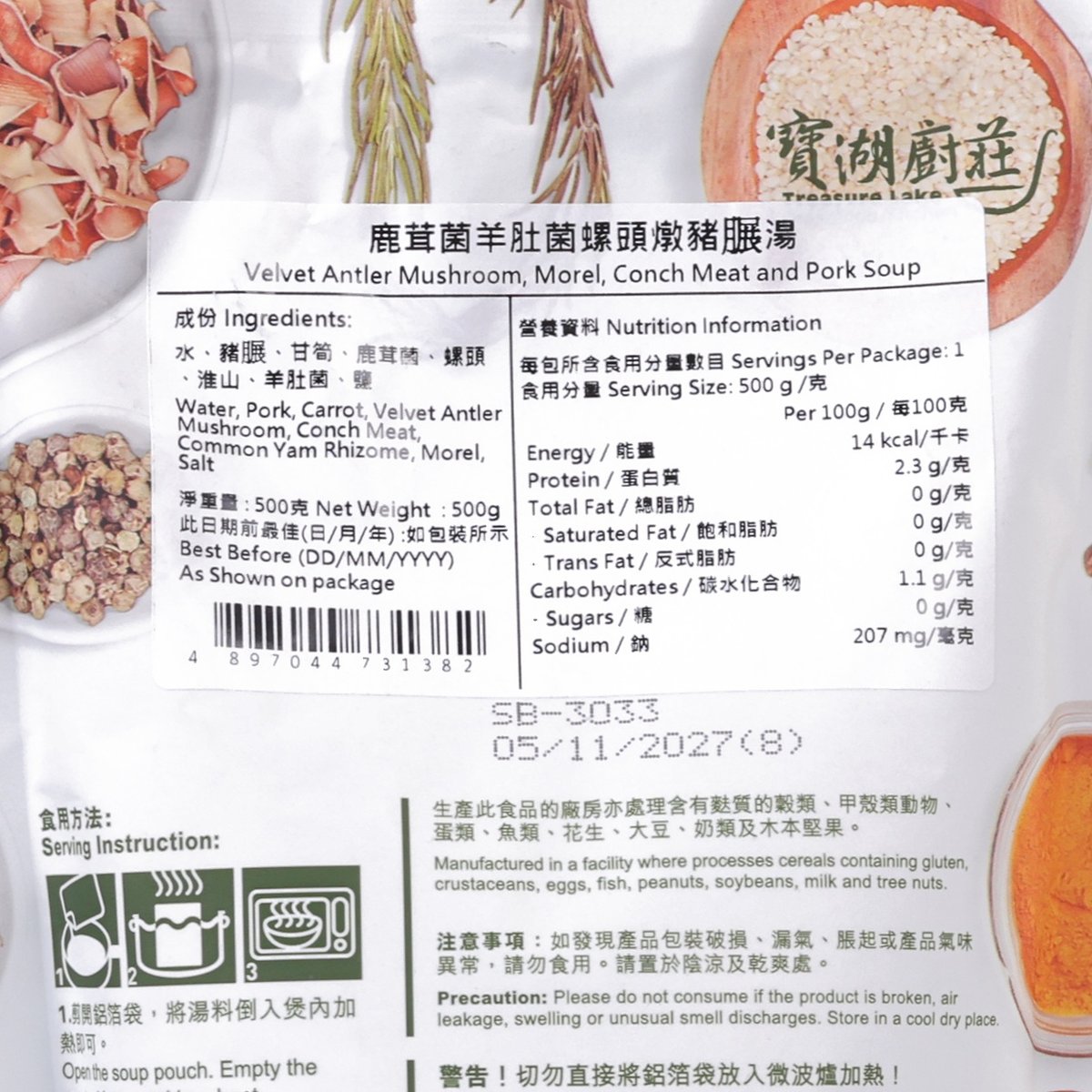 鹿茸菌含有豐富蛋白質和氨基酸,營養價值高。其馥郁的菌香能夠為螺頭、豬𦟌等提鮮,互相調和成為濃淡適宜兼具層次的保健湯水。可改善過敏體質及增強免疫力。100%香港製造。無添加味精、防腐劑及人造色素。